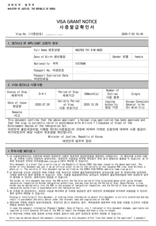 - Khi nhập cảnh Hàn Quốc, bạn cần làm thẻ người nước ngoài và visa sẽ có hiệu lực 6 tháng đối với chương trình D4-1.